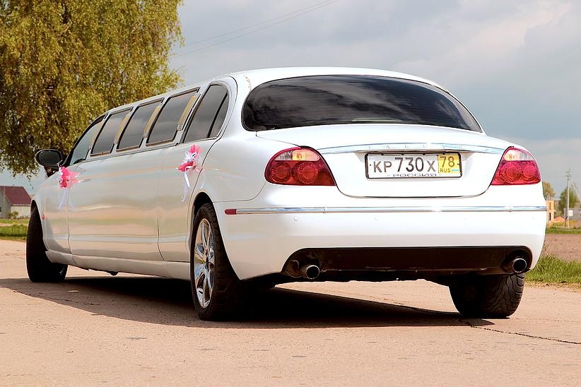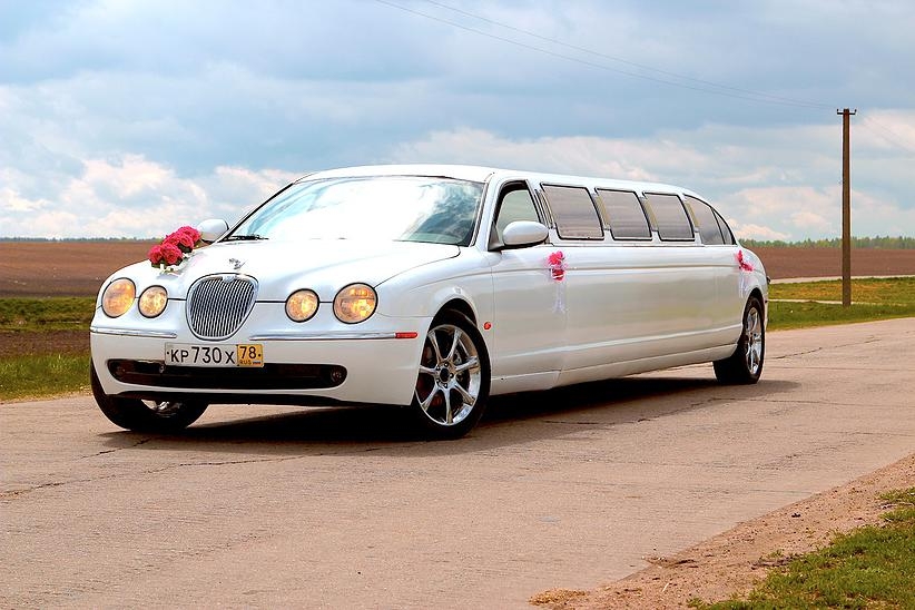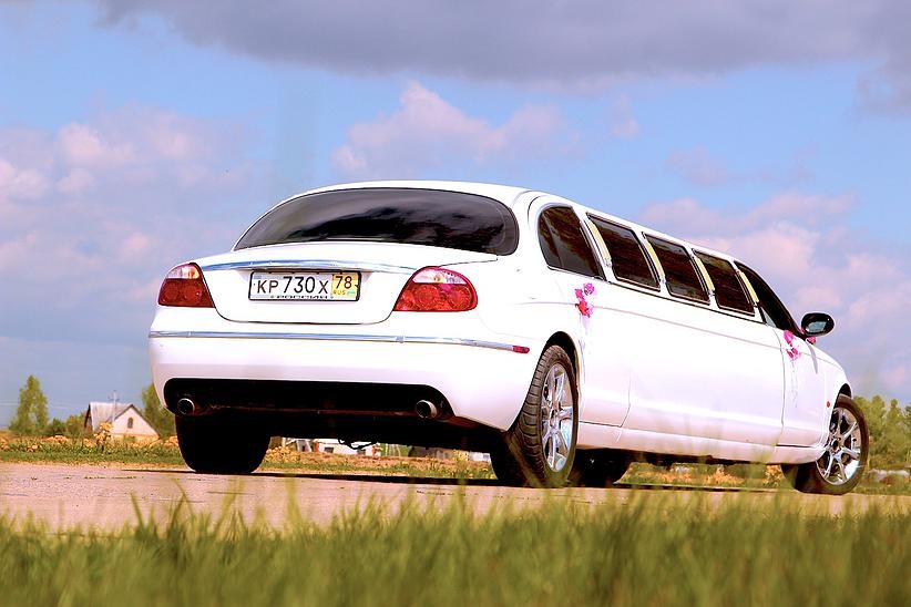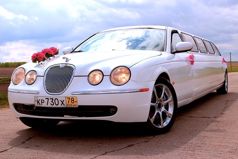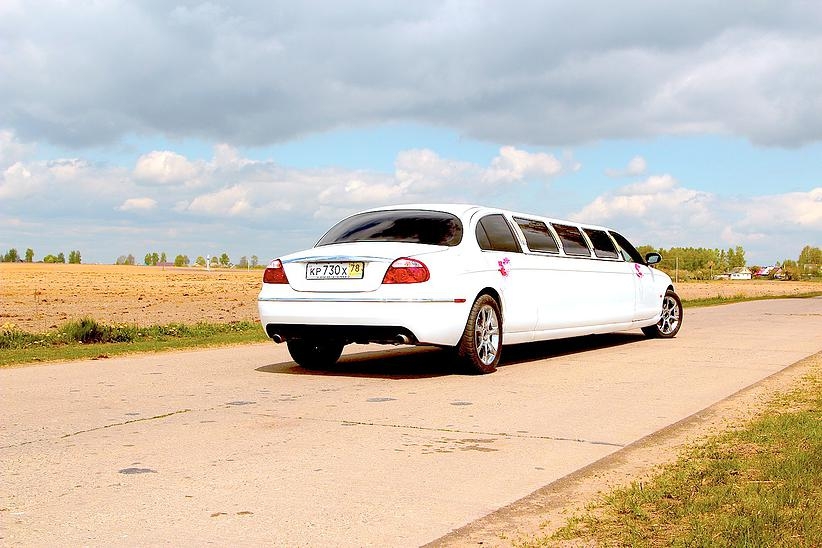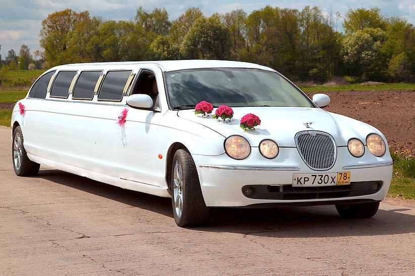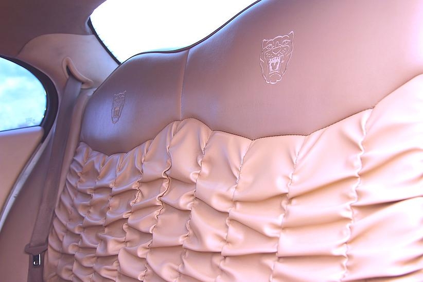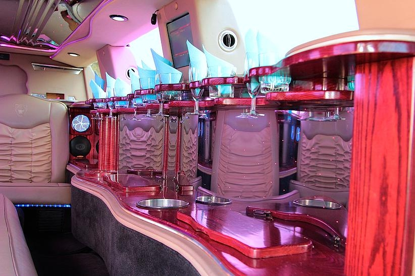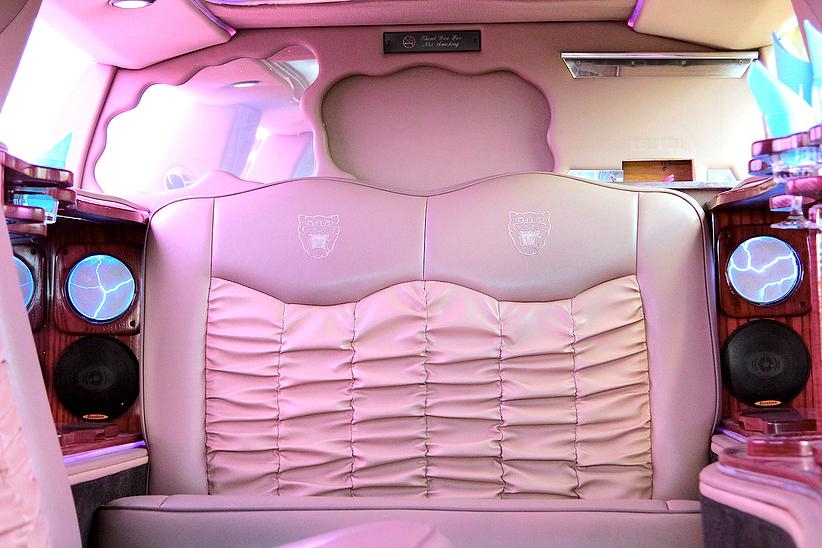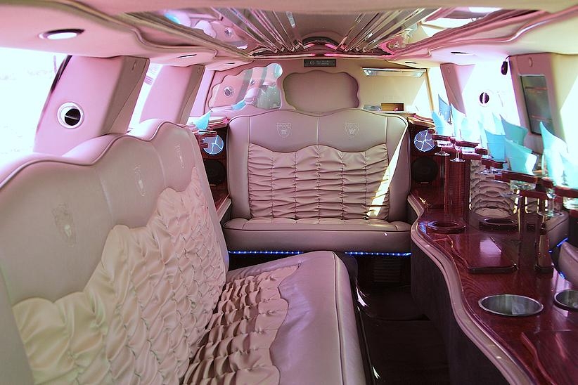 Отделка бара лимузина красным деревом, звездное небо , эффект шаровых молний. Сиденья из кожи со складками, выполненные наподобие свадебного платья.
